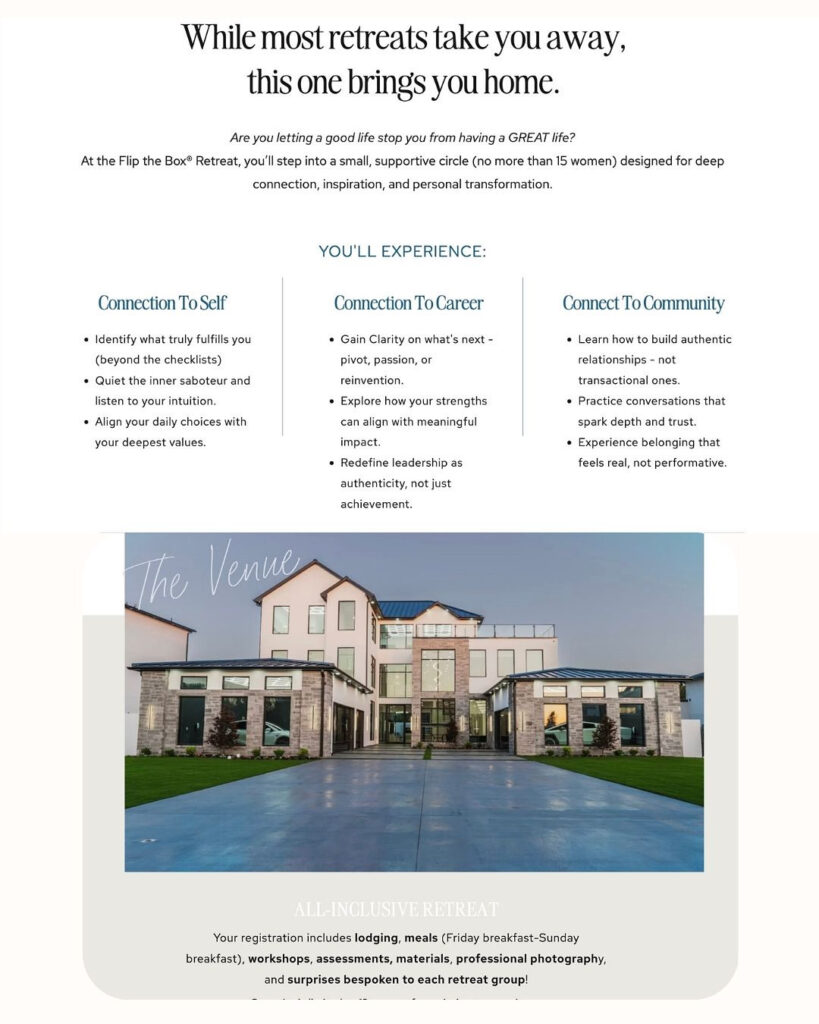 The Flip The Box® Retreat is different. This is the brainchild of Shari Leid, a nationally recognized connection coach and TEDx speaker who has spent years perfecting the art of helping people break free from the invisible boxes that keep them stuck. We’re talking about a 3-day immersive experience de-signed specifically for leaders, changemakers, and growth-minded women who are standing at cross-roads in their lives.